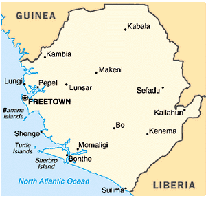 SIERRA LEONE is a country in West Africa. It is bordered by Guinea on the north and Liberia on the south, with the Atlantic Ocean on the west. |