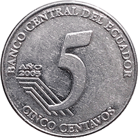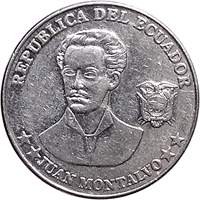 The inscriptions along the rim: 'CENTRAL BANK OF ECUADOR'. Denomination in numerals and words, the year of minting. |