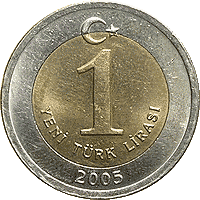 Crescent and star, in the center: face value, below - the year of minting. Coins were introduced in 2005 in denominations of 1, 5, 10, 25 and 50 new kuruş and 1 new lira. (1 new lira = 1.000.000 old lira.) |